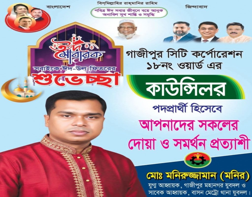 গাজীপুর ১৮নং ওয়ার্ড প্রার্থী মনিরুজ্জামানের ঈদ শুভেচ্ছা